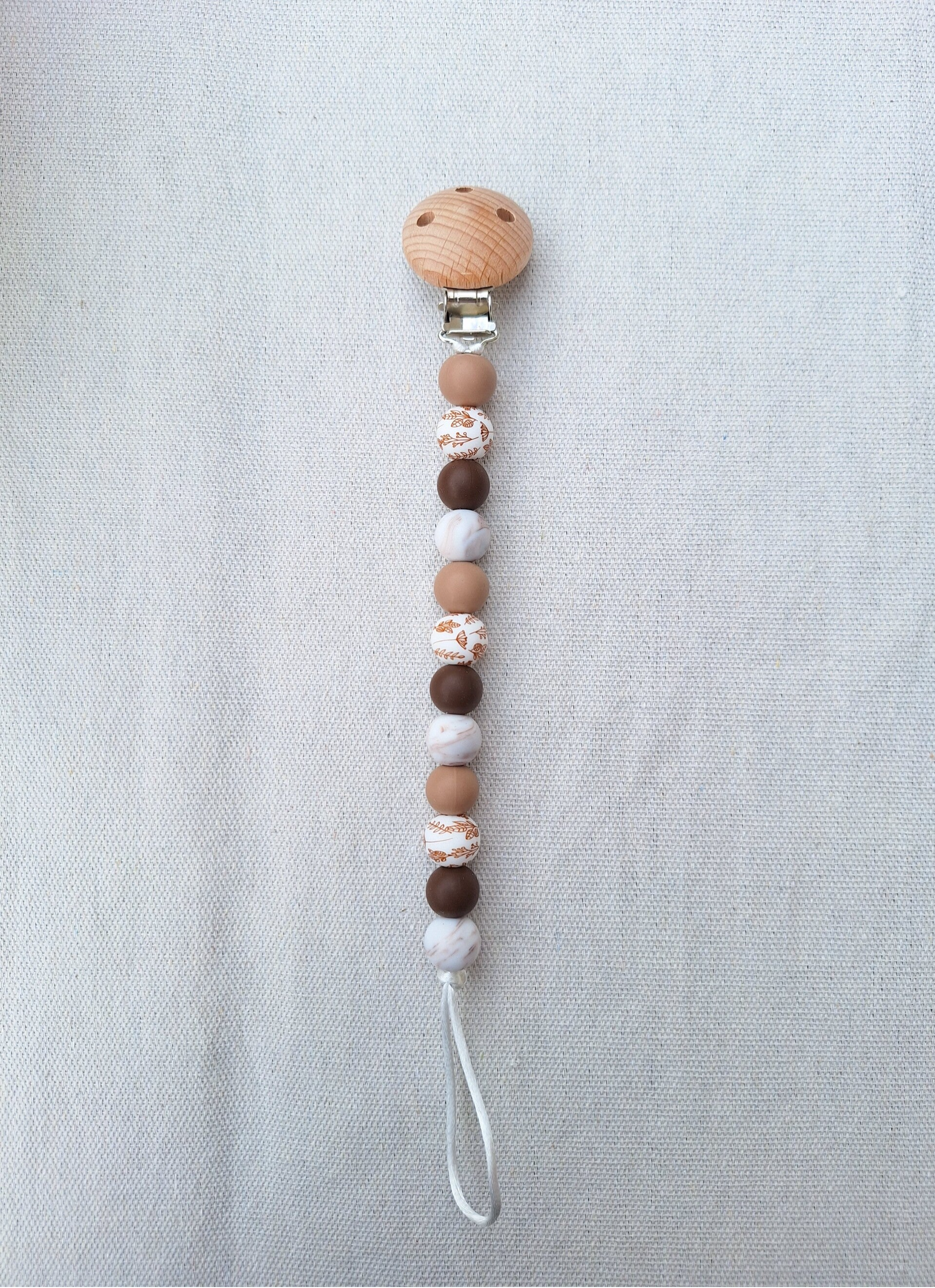 Uniek en fleurige speenkoord gemaakt volgens de veiligheidseisen. Het draad is dubbel geregen, heeft een dubbele knoop en is max 22 cm lang. De beukenhouten speenclip heeft 3 gaatjes.