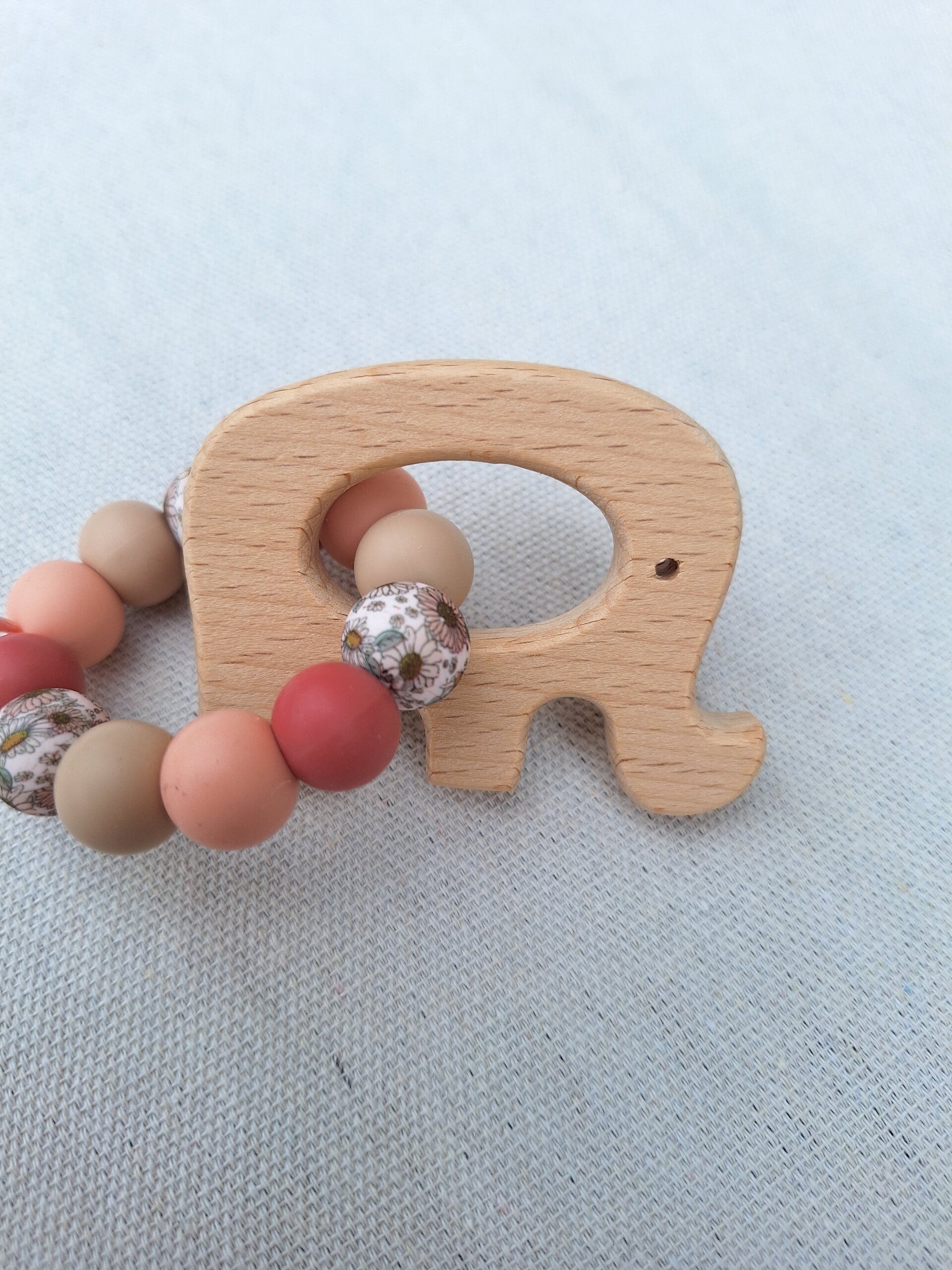 De bijtring is gemaakt volgens de veiligheidseisen, geregen op satijnkoord en dubbel geknoopt. Het houten figuur is van beukenhout en de kralen zijn van siliconen.