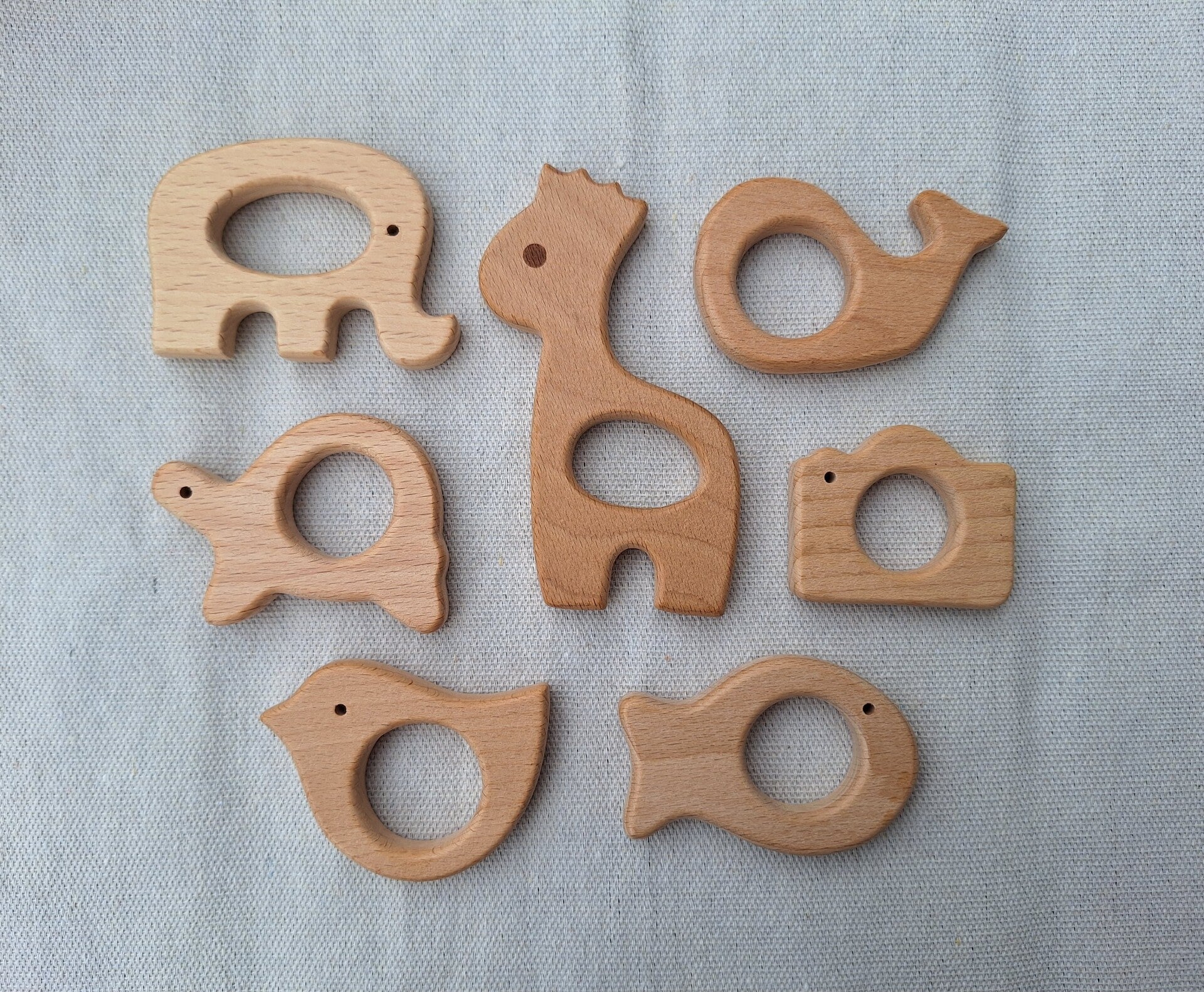 Wil je de bijtring gepersonaliseerd? Dat kan! Kies een houten figuur uit van foto 2 (olifant, giraffe, walvis, schildpas, vis, vogel, fototoestel) En geef de naam via het formulier door.