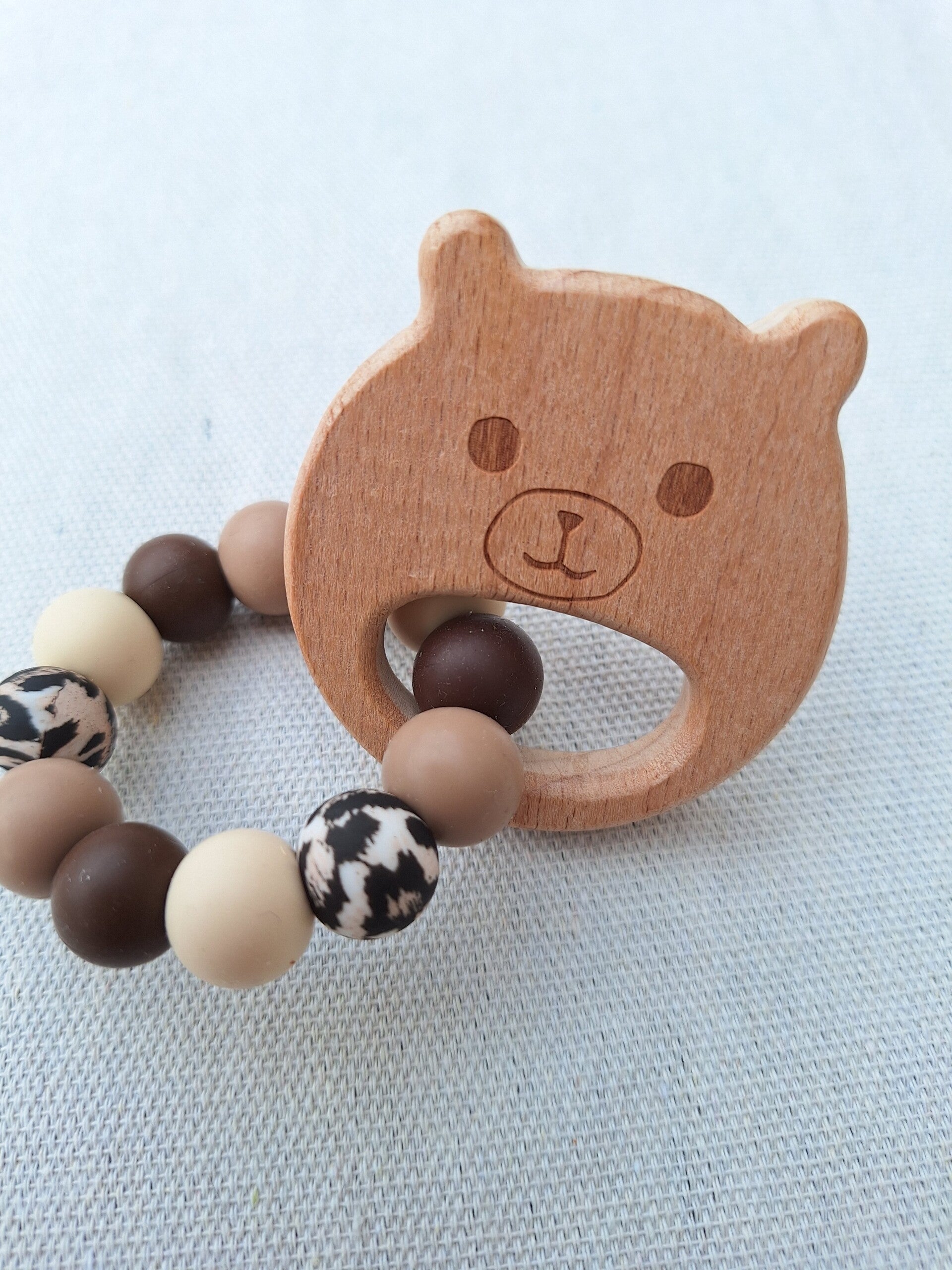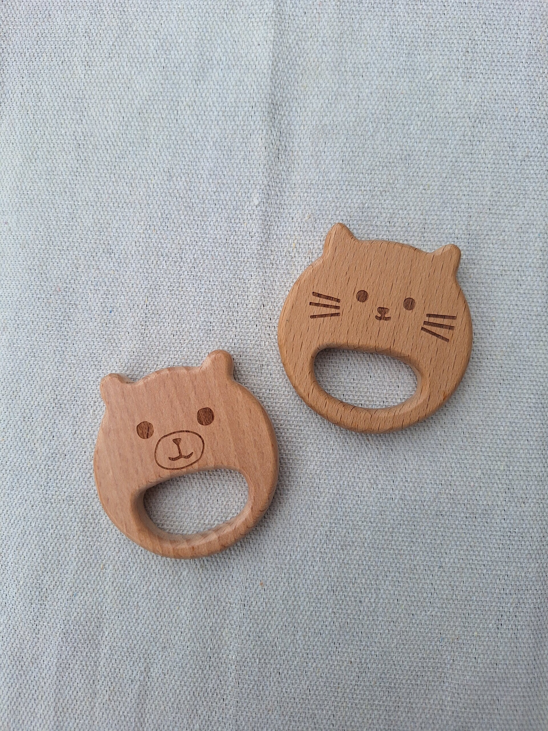 De bijtring is gemaakt volgens de veiligheidseisen, geregen op satijnkoord en dubbel geknoopt. Het houten figuur is van beukenhout en de kralen zijn van siliconen.