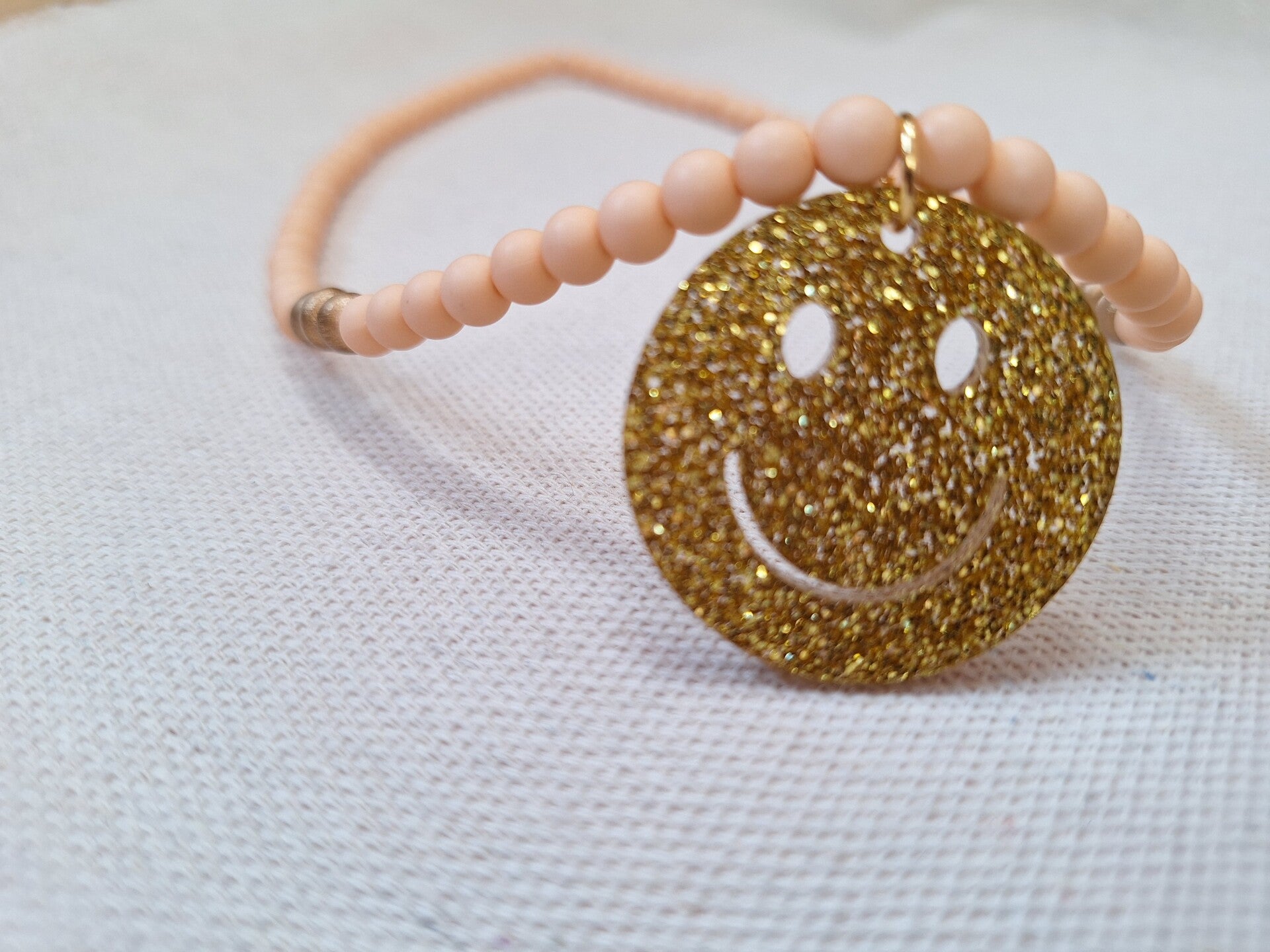 De ketting is geregen met 6 mm kraaltjes van acryl. De gouden kraaltjes zijn van hout en de hanger is gesneden met de laser van een prachtige acrylplaat.