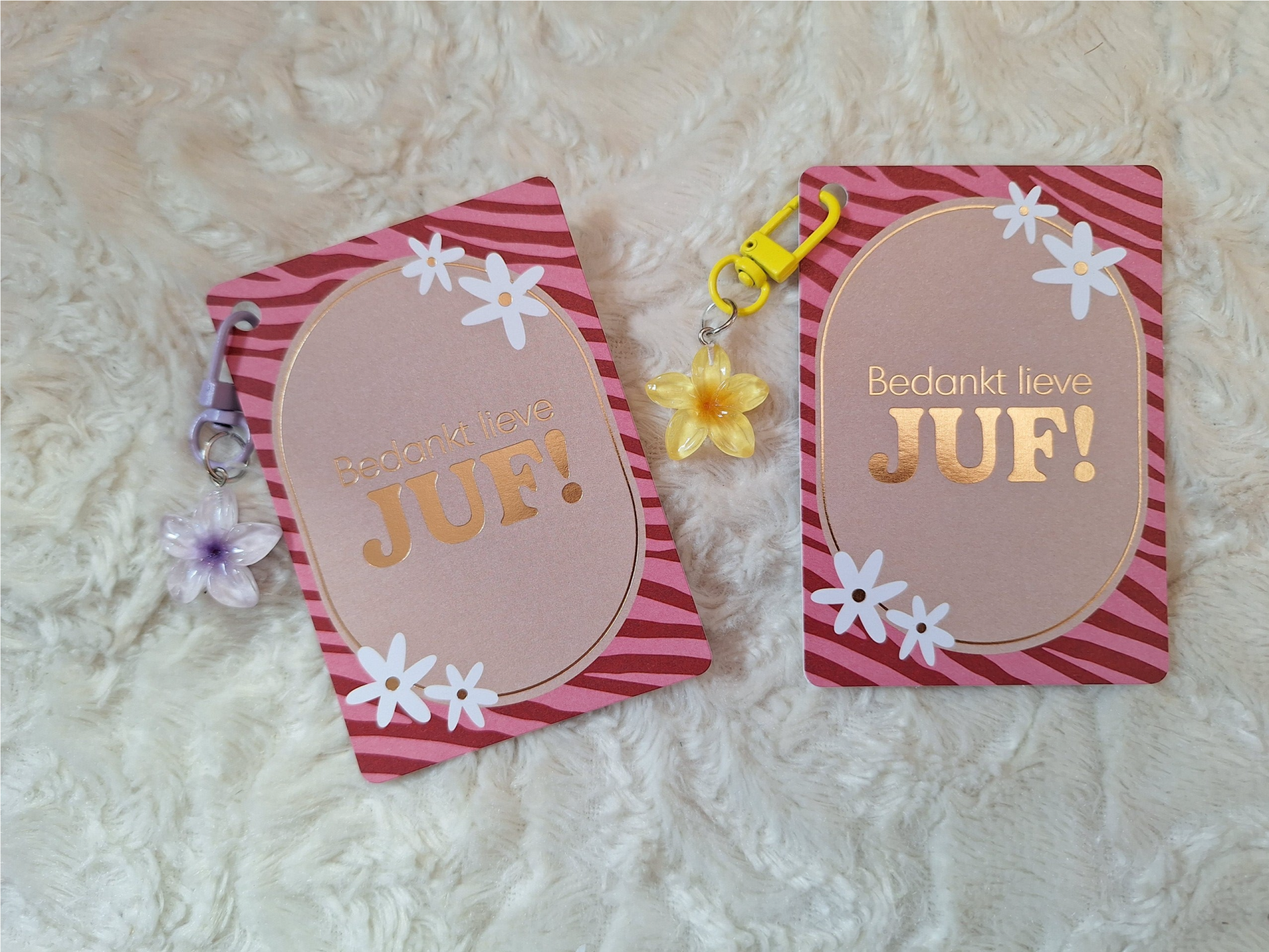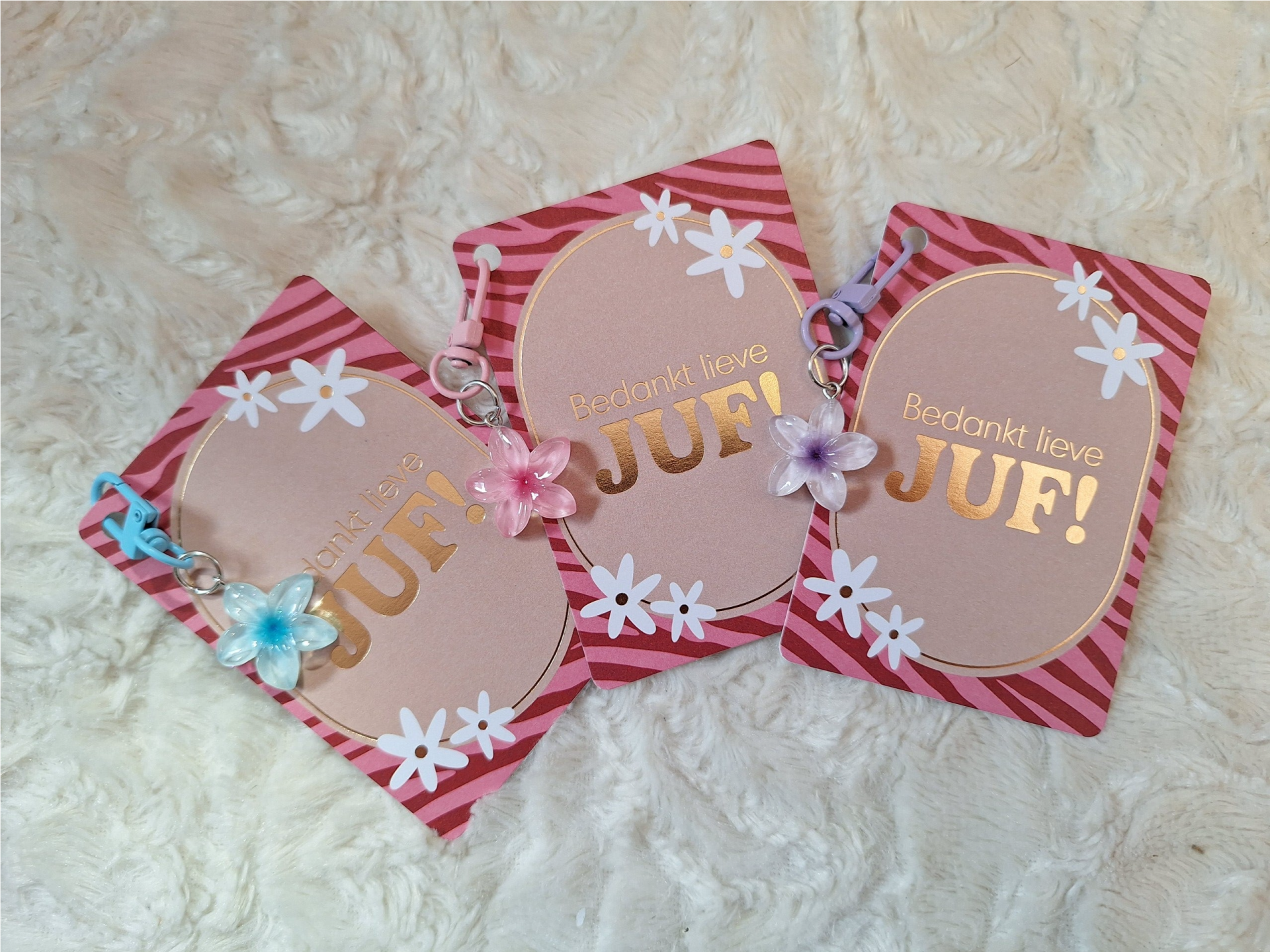 Verras de juf met een fleurig kaartje & een tashanger met bloemetje voor de juf.