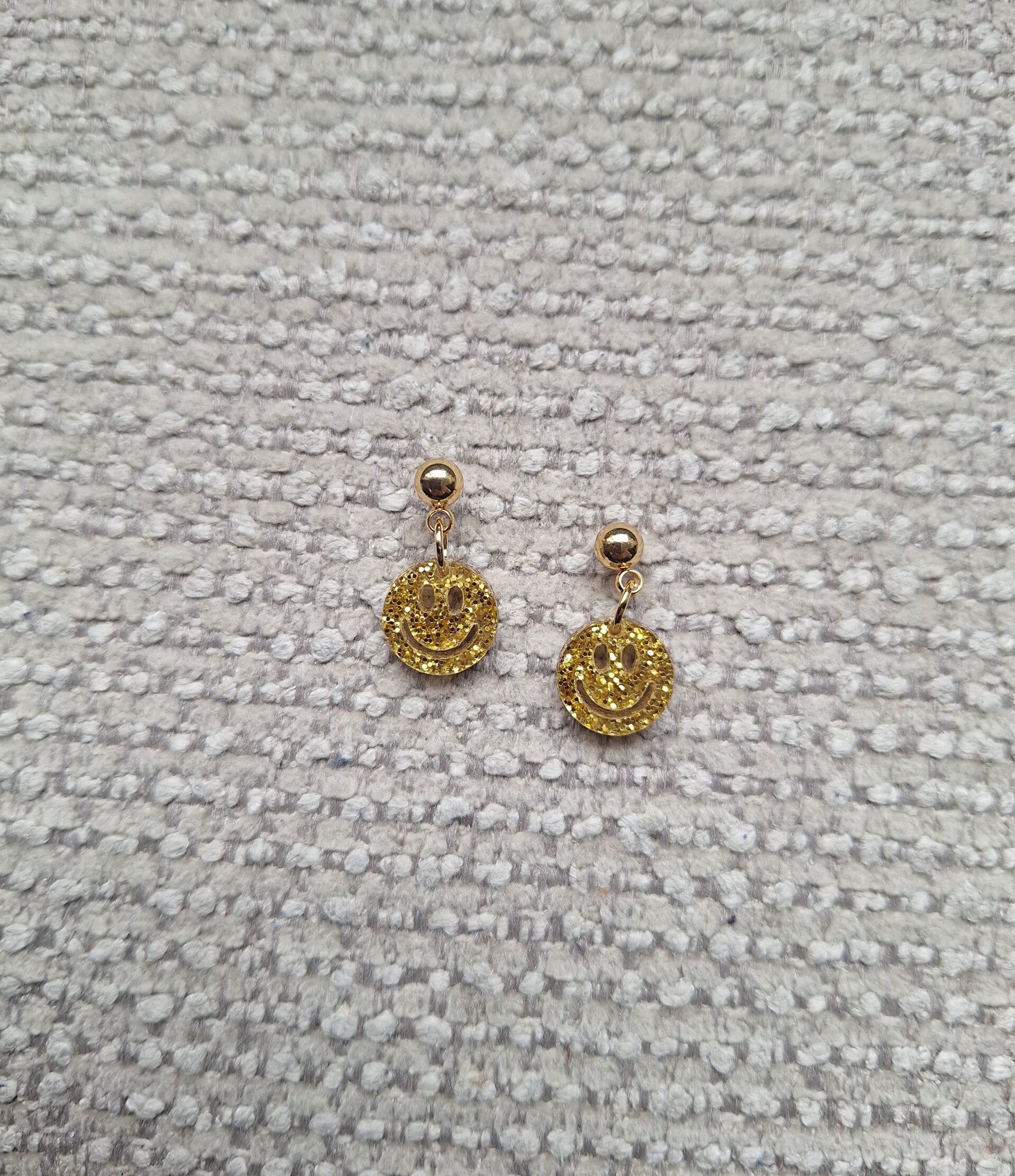Schattig maatje oorbel met een smiley. Het hangertje is van glitteracryl gemaakt en het knopje is van Roestvrijstaal.