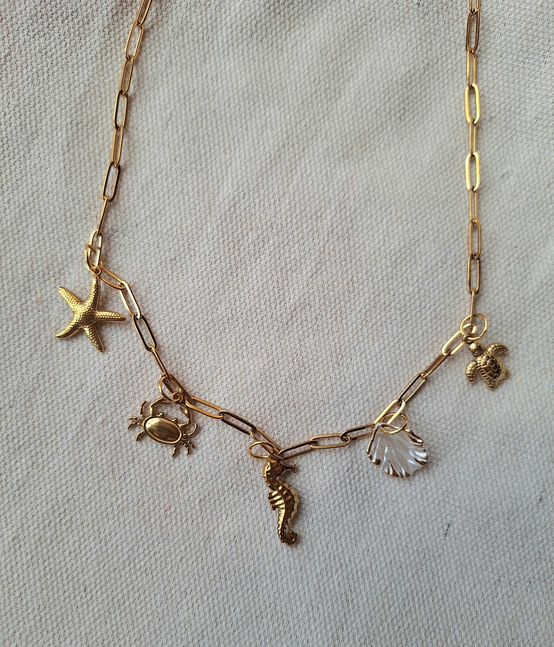 Materiaal bedels: Roestvrijstaal, behalve het witte schelpje dat is vacuumzakken acryl