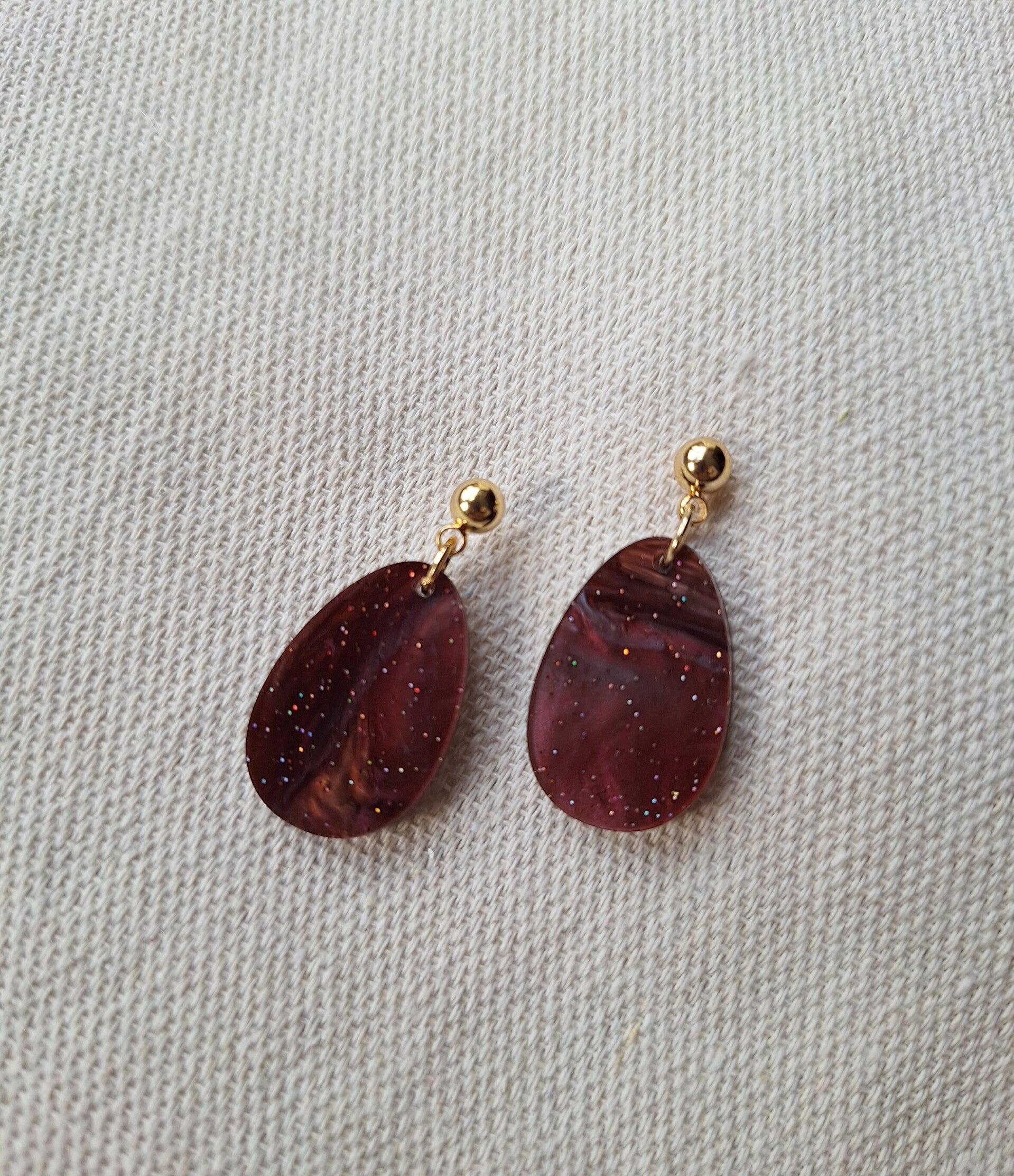 Tijdens het maken van deze oorbellen was ik onder de indruk van het prachtige kleuren spel in de plaat acryl waar de oorbellen uitgesneden werden. Verschillende tinten Rood en paars met een glittertje erdoor.
