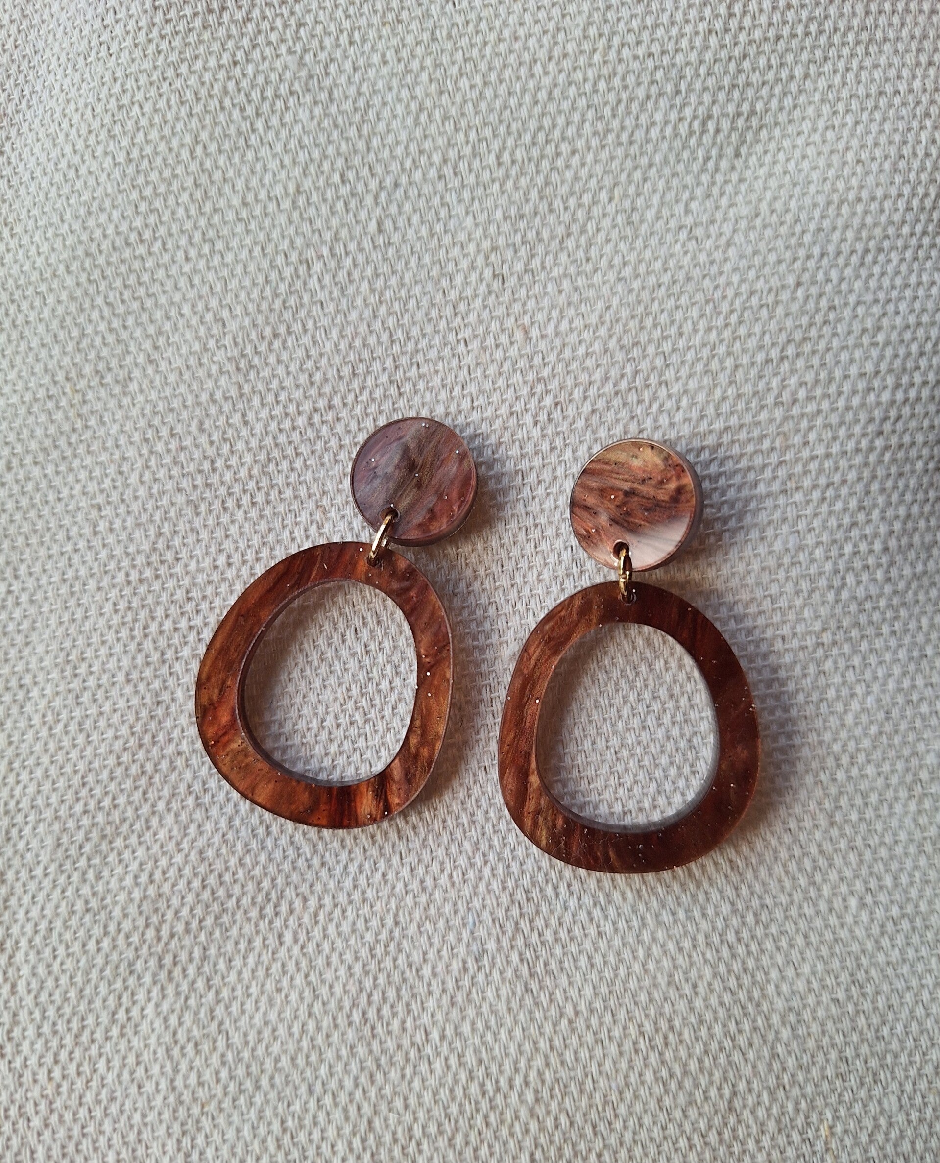 Tijdens het maken van deze oorbellen was ik onder de indruk van het prachtige kleuren spel in de plaat acryl waar de oorbellen uitgesneden werden. Verschillende tinten bruin met een glittertje erdoor.