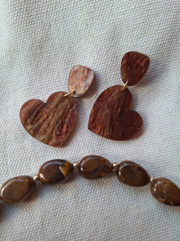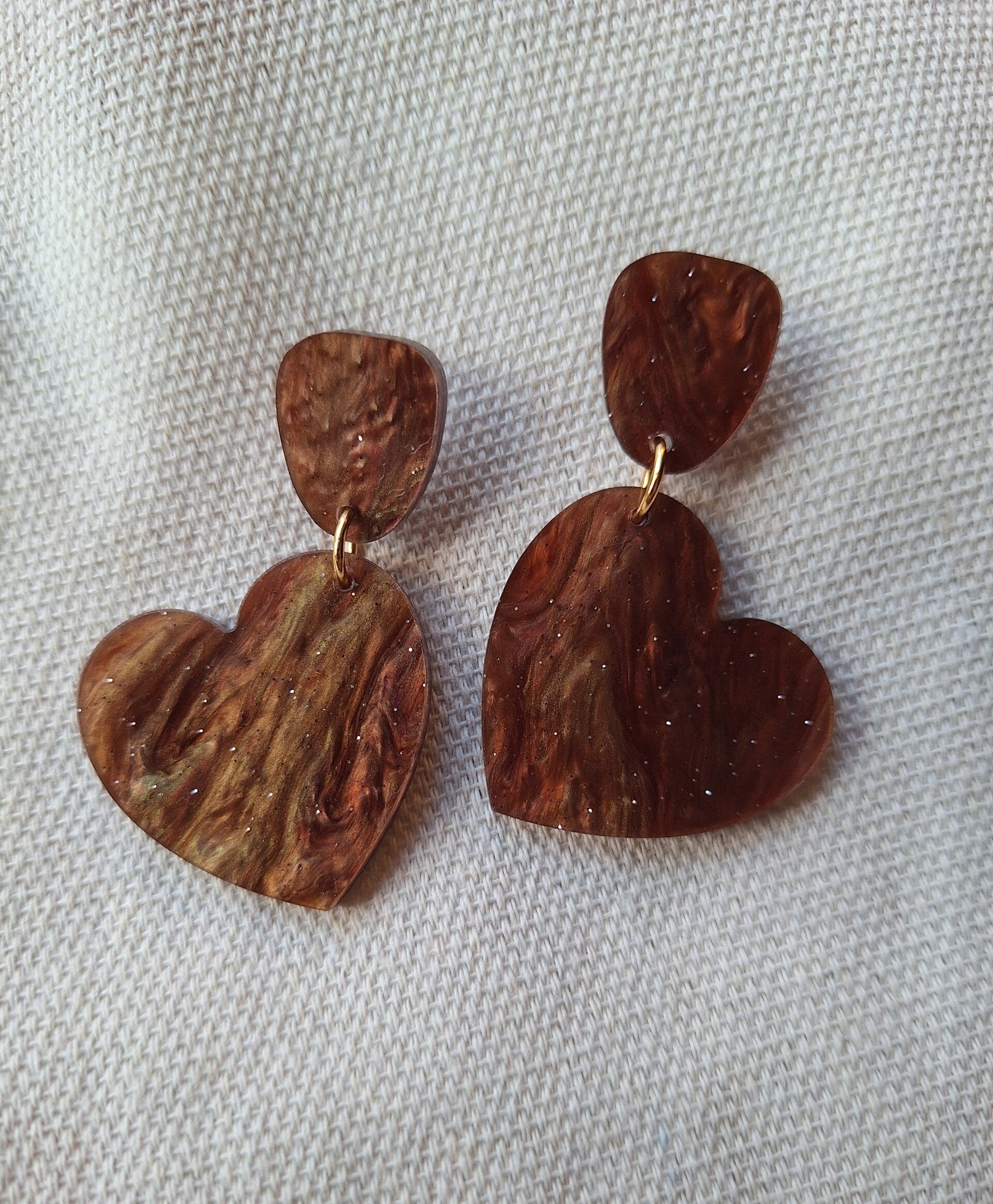 Tijdens het maken van deze oorbellen was ik onder de indruk van het prachtige kleuren spel in de plaat acryl waar de oorbellen uitgesneden werden. Verschillende tinten bruin met een glittertje erdoor.