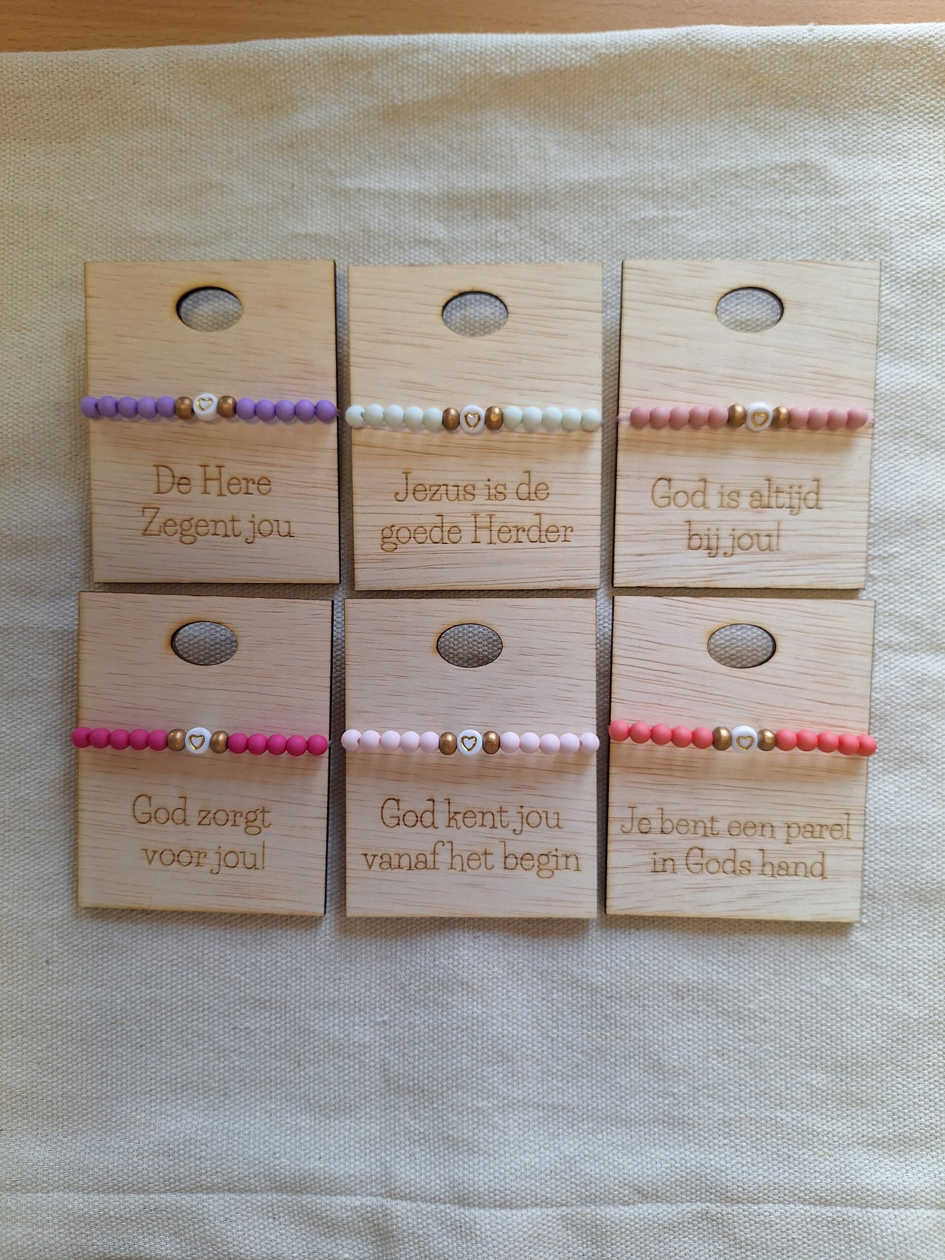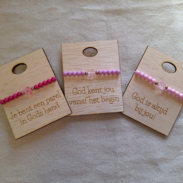 18x houten Kaartjes met christelijke tekst en een Kinderarmbandje. In verschillende leuke kleurtjes. Met een bloemetje of hartje in het midden.