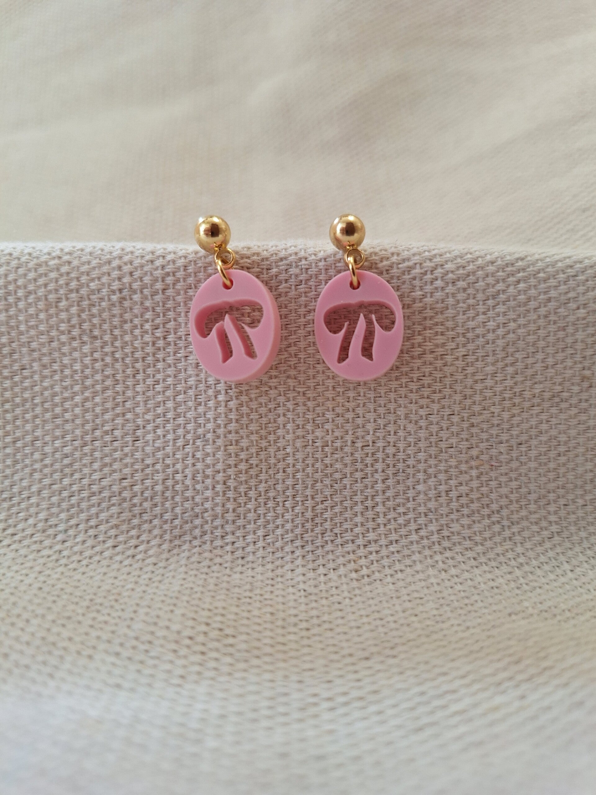 Schattig maatje oorbel met een strikje. Het hangertje is van acryl gemaakt en het knopje is van Roestvrijstaal. De oorbel is verkrijgbaar met een goudkleurig of zilverkleurig knopje.